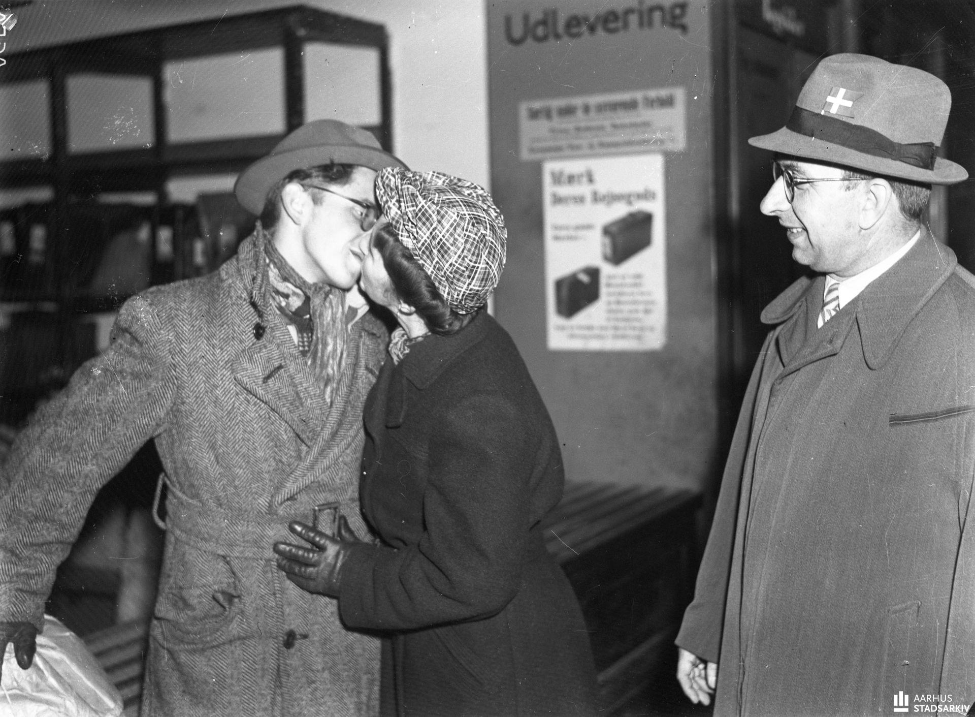 Fanger fra Frøslevlejren ankommer med tog til Aarhus.
