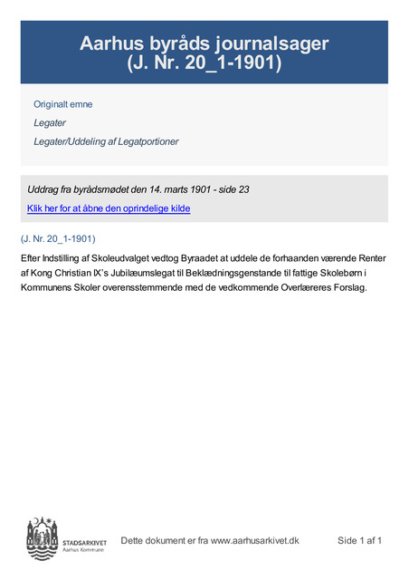 Efter Indstilling af Skoleudvalget vedtog Byraadet at uddele de forhaanden værende Renter af Kong Christian IX’s Jubilæumslegat til Beklædningsgenstande til fattige Skolebørn i Kommunens Skoler overensstemmende med de vedkommende Overlæreres Forslag.
