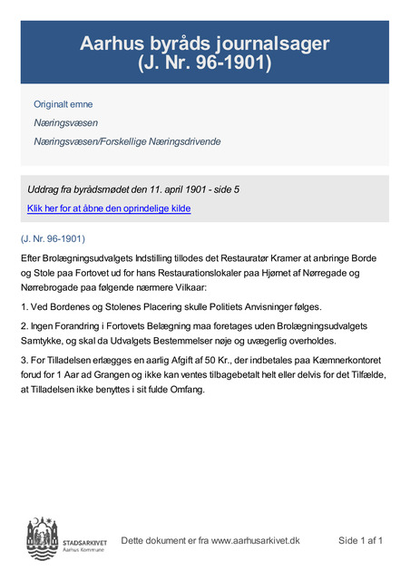 Efter Brolægningsudvalgets Indstilling tillodes det Restauratør Kramer at anbringe Borde og Stole paa Fortovet ud for hans Restaurationslokaler paa Hjørnet af Nørregade og Nørrebrogade paa følgende nærmere Vilkaar:
