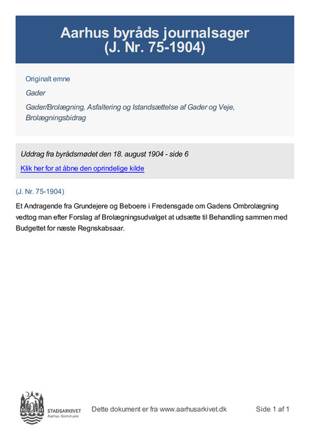 Et Andragende fra Grundejere og Beboere i Fredensgade om Gadens Ombrolægning vedtog man efter Forslag af Brolægningsudvalget at udsætte til Behandling sammen med Budgettet for næste Regnskabsaar.