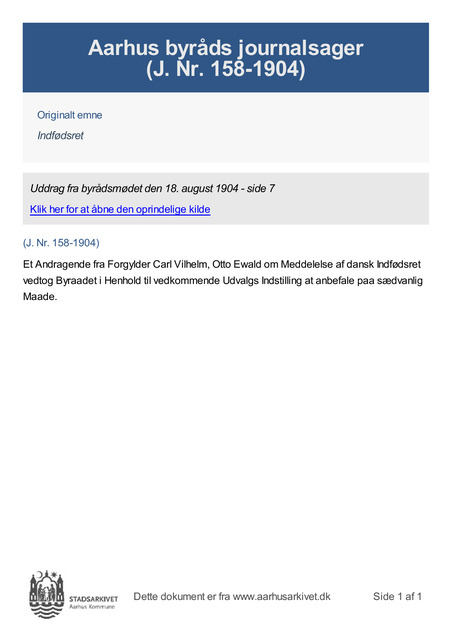 Et Andragende fra Forgylder Carl Vilhelm, Otto Ewald om Meddelelse af dansk Indfødsret vedtog Byraadet i Henhold til vedkommende Udvalgs Indstilling at anbefale paa sædvanlig Maade.