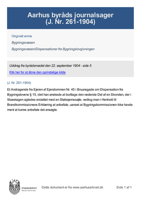 Et Andragende fra Ejeren af Ejendommen Nr. 45 i Bruunsgade om Dispensation fra Bygningslovens § 15, idet han ønskede at borttage den nederste Del af en Skorsten, der i Stueetagen agtedes erstattet med en Støbejernssøjle, vedtog man i Henhold til Brandkommissionens Erklæring at anbefale, uanset at Bygningskommissionen ikke havde ment at kunne anbefale det ansøgte.