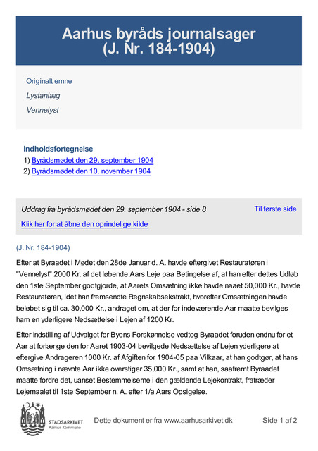 Efter at Byraadet i Mødet den 28de Januar d. A. havde eftergivet Restauratøren i "Vennelyst" 2000 Kr. af det løbende Aars Leje paa Betingelse af, at han efter dettes Udløb den 1ste September godtgjorde, at Aarets Omsætning ikke havde naaet 50,000 Kr., havde Restauratøren, idet han fremsendte Regnskabsekstrakt, hvorefter Omsætningen havde beløbet sig til ca. 30,000 Kr., andraget om, at der for ind...