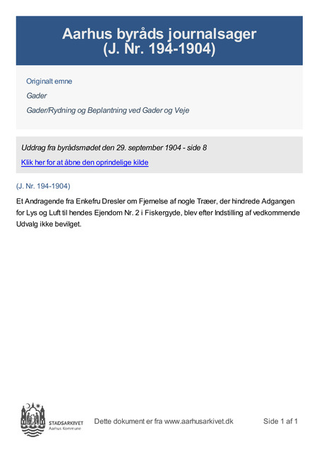 Et Andragende fra Enkefru Dresler om Fjernelse af nogle Træer, der hindrede Adgangen for Lys og Luft til hendes Ejendom Nr. 2 i Fiskergyde, blev efter Indstilling af vedkommende Udvalg ikke bevilget.