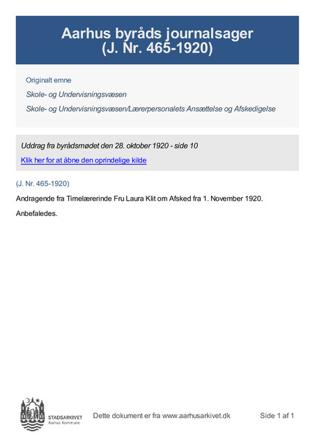 Andragende fra Timelærerinde Fru Laura Klit om Afsked fra 1. November 1920.