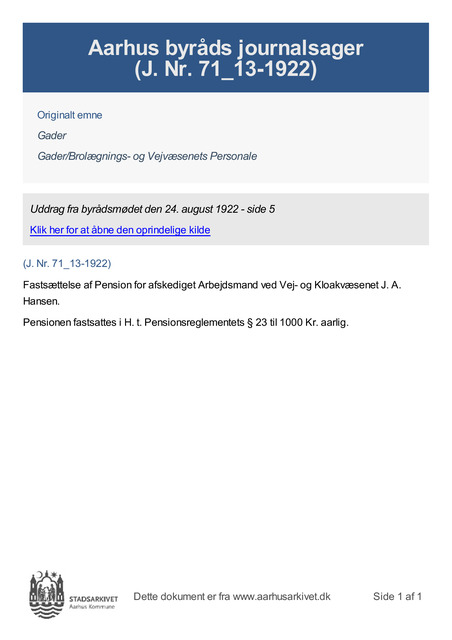 Fastsættelse af Pension for afskediget Arbejdsmand ved Vej- og Kloakvæsenet J. A. Hansen.