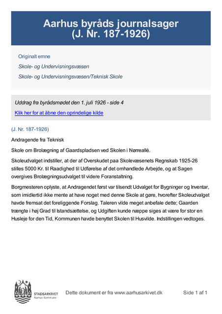 Skoleudvalget indstiller, at der af Overskudet paa Skolevæsenets Regnskab 1925-26 stilles 5000 Kr. til Raadighed til Udførelse af det omhandlede Arbejde, og at Sagen overgives Brolægningsudvalget til videre Foranstaltning.