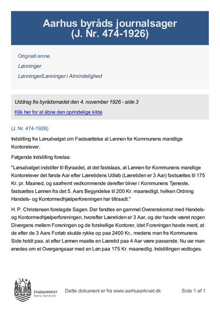"Lønudvalget indstiller til Byraadet, at det fastslaas, at Lønnen for Kommunens mandlige Kontorelever det første Aar efter Læretidens Udløb (Læretiden er 3 Aar) fastsættes til 175 Kr. pr. Maaned, og saafremt vedkommende derefter bliver i Kommunens Tjeneste, fastsættes Lønnen fr...