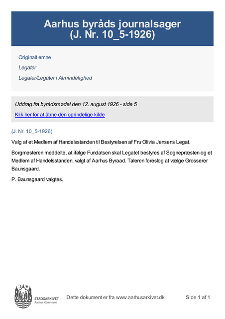 Valg af et Medlem af Handelsstanden til Bestyrelsen af Fru Olivia Jensens Legat.