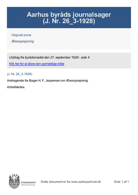 Andragende fra Bager H. F, Jespersen om Æresoprejsning.