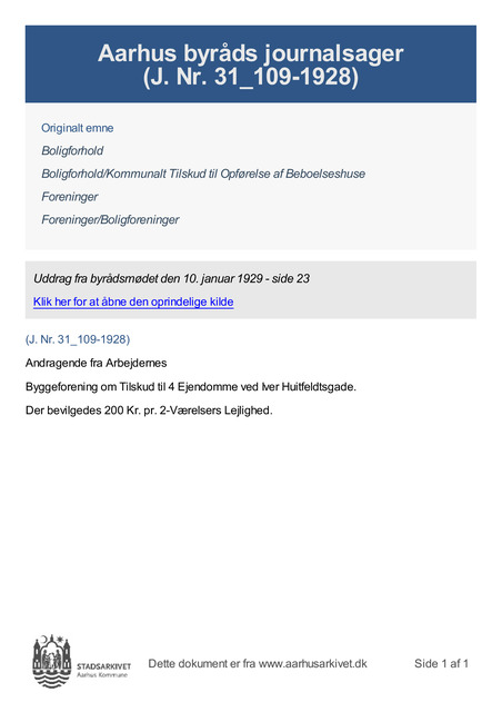 Byggeforening om Tilskud til 4 Ejendomme ved Iver Huitfeldtsgade.