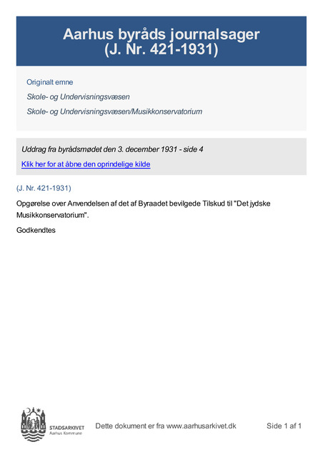 Opgørelse over Anvendelsen af det af Byraadet bevilgede Tilskud til "Det jydske Musikkonservatorium".