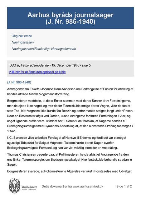 Borgmesteren meddelte, at de to Enker sammen med deres Sønner drev Forretningerne, men de ejede ikke noget, og hvis de for Tiden skulde sælge deres Vogne, vilde de faa et stort Tab, idet Vognene ikke kunde faa Benzin og derfor maatte sælges langt under Prisen. Naar en Re...