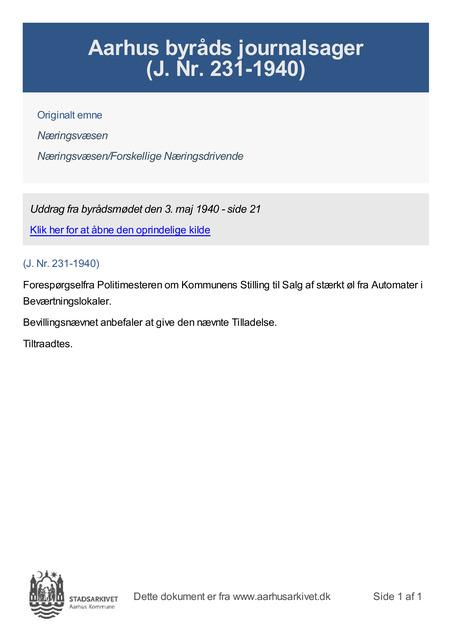 Forespørgselfra Politimesteren om Kommunens Stilling til Salg af stærkt øl fra Automater i Beværtningslokaler.