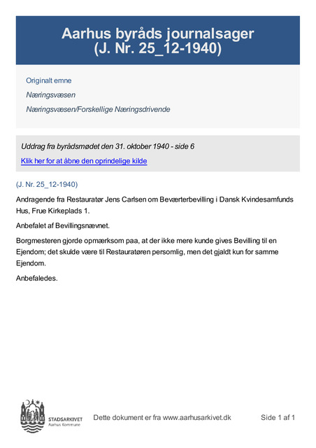 Andragende fra Restauratør Jens Carlsen om Beværterbevilling i Dansk Kvindesamfunds Hus, Frue Kirkeplads 1.