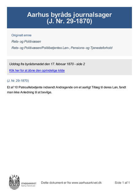 Et af 10 Patrouillebetjente indsendt Andragende om et aarligt Tillæg til deres Løn, fandt man ikke Anledning til at bevilge.