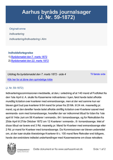Indkvarteringscommissionen meddeelte, at den, i anledning af at 140 mand af Fodfolket fra den 1ste April d. A. skulle fra Kasernerne indkvarteres i byen, først havde ladet afholde mundtlig licitation over kvarterer med enmandssenge, men at der ved samme kun var bleven gjort bud paa kvarterer til 64 mand for priser fra 20 Mk. til 24 mk. maanedlig pr. mand, og at den derefter havde ladet afholde sk...