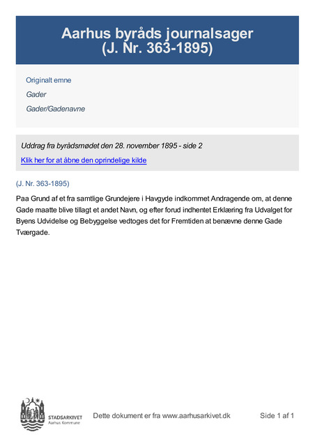 Paa Grund af et fra samtlige Grundejere i Havgyde indkommet Andragende om, at denne Gade maatte blive tillagt et andet Navn, og efter forud indhentet Erklæring fra Udvalget for Byens Udvidelse og Bebyggelse vedtoges det for Fremtiden at benævne denne Gade Tværgade.