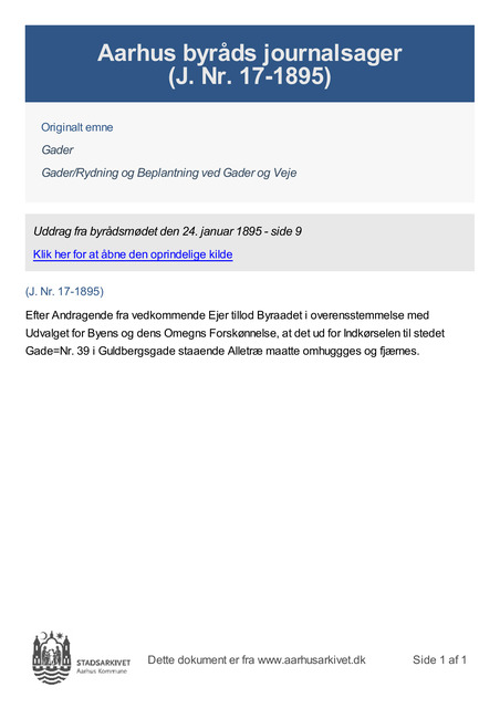 Efter Andragende fra vedkommende Ejer tillod Byraadet i overensstemmelse med Udvalget for Byens og dens Omegns Forskønnelse, at det ud for Indkørselen til stedet Gade=Nr. 39 i Guldbergsgade staaende Alletræ maatte omhuggges og fjærnes.