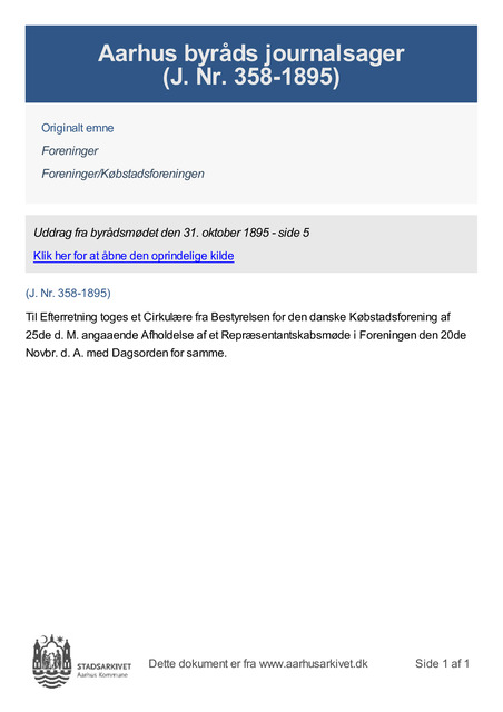 Til Efterretning toges et Cirkulære fra Bestyrelsen for den danske Købstadsforening af 25de d. M. angaaende Afholdelse af et Repræsentantskabsmøde i Foreningen den 20de Novbr. d. A. med Dagsorden for samme.
