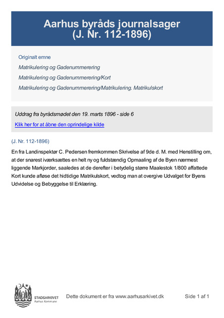 En fra Landinspektør C. Pedersen fremkommen Skrivelse af 9de d. M. med Henstilling om, at der snarest iværksættes en helt ny og fuldstændig Opmaaling af de Byen nærmest liggende Markjorder, saaledes at de derefter i betydelig større Maalestok 1/800 affattede Kort kunde afløse det hidtidige Matrikulskort, vedtog man at overgive Udvalget for Byens Udvidelse og Bebyggelse til Erklæring.