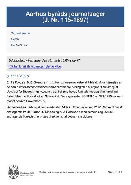 En fra Fotograf B. E. Svendsen m. f.. fremkommen skrivelse af 14de d. M. om fjernelse af de paa Klemensbroen værende hjørnekandelabre bedtog man at afgive til erklæring af Udvalget for Brolægnings-væsenet, der tidligere havde faaet denne sag til behandling i forbindelse med Udvalget for Gasværket, (Se sagerne Nr. 354/1895 og 371/1895 senest i mødet den 5te November f. A.)