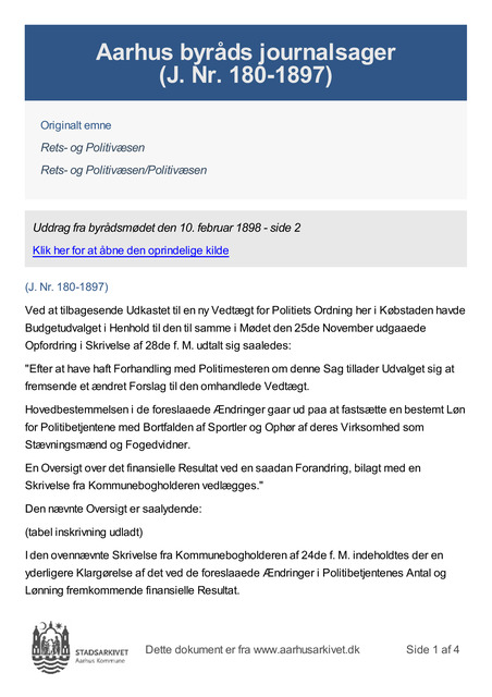 Ved at tilbagesende Udkastet til en ny Vedtægt for Politiets Ordning her i Købstaden havde Budgetudvalget i Henhold til den til samme i Mødet den 25de November udgaaede Opfordring i Skrivelse af 28de f. M. udtalt sig saaledes: