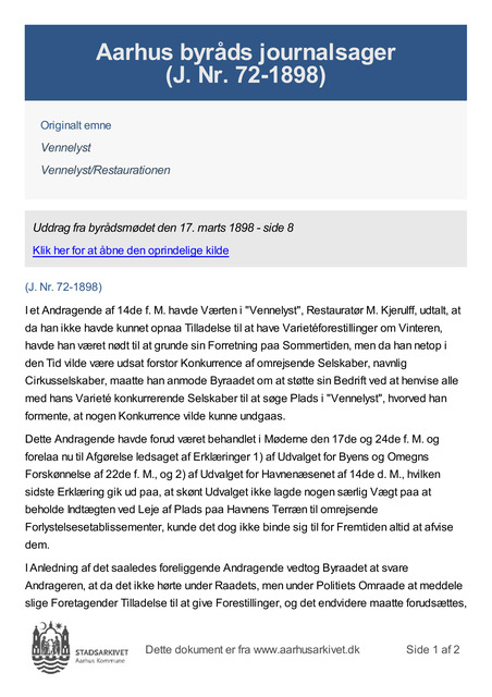 I et Andragende af 14de f. M. havde Værten i "Vennelyst", Restauratør M. Kjerulff, udtalt, at da han ikke havde kunnet opnaa Tilladelse til at have Varietéforestillinger om Vinteren, havde han været nødt til at grunde sin Forretning paa Sommertiden, men da han netop i den Tid vilde være udsat forstor Konkurrence af omrejsende Selskaber, navnlig Cirkusselskaber, maatte han anmode Byraadet om at s...