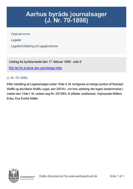 Efter indstilling af Legatudvalget under 15de d. M. bortgaves en ledige portion af Rudolph Wulffs og Ida Marie Wulffs Legat, stor 200 Kr., om hvis uddeling der toges bestemmelse i mødet den 13de f. M. undser sag Nr. 25/1893, til afdøde Justitsraad, Vejinspetør Müllers Enke, Eva Emilie Müller.