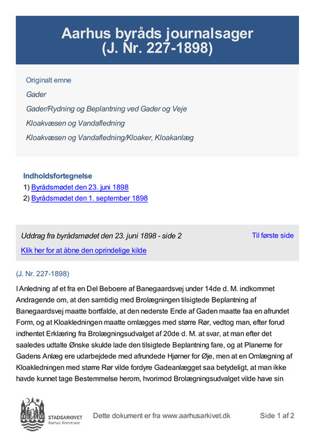 I Anledning af et fra en Del Beboere af Banegaardsvej under 14de d. M. indkommet Andragende om, at den samtidig med Brolægningen tilsigtede Beplantning af Banegaardsvej maatte bortfalde, at den nederste Ende af Gaden maatte faa en afrundet Form, og at Kloakledningen maatte omlægges med større Rør, vedtog man, efter forud indhentet Erklæring fra Brolægningsudvalget af 20de d. M. at svar, at man ef...