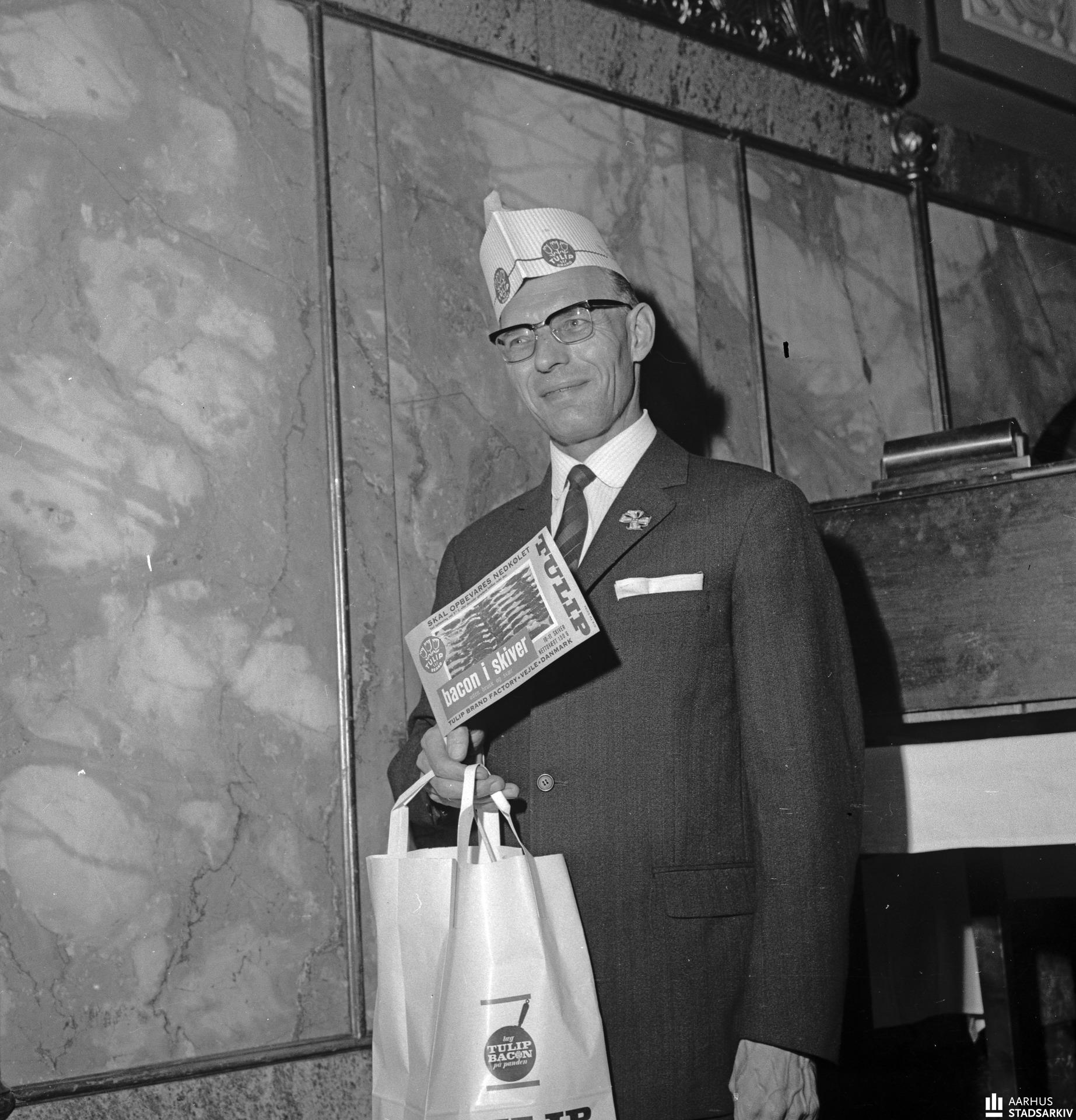 Direktør Willy Horn i jakkesæt fotograferet med Tulip bacon i skiver, en papirhat på hovedet og en pose i den ene hånd.