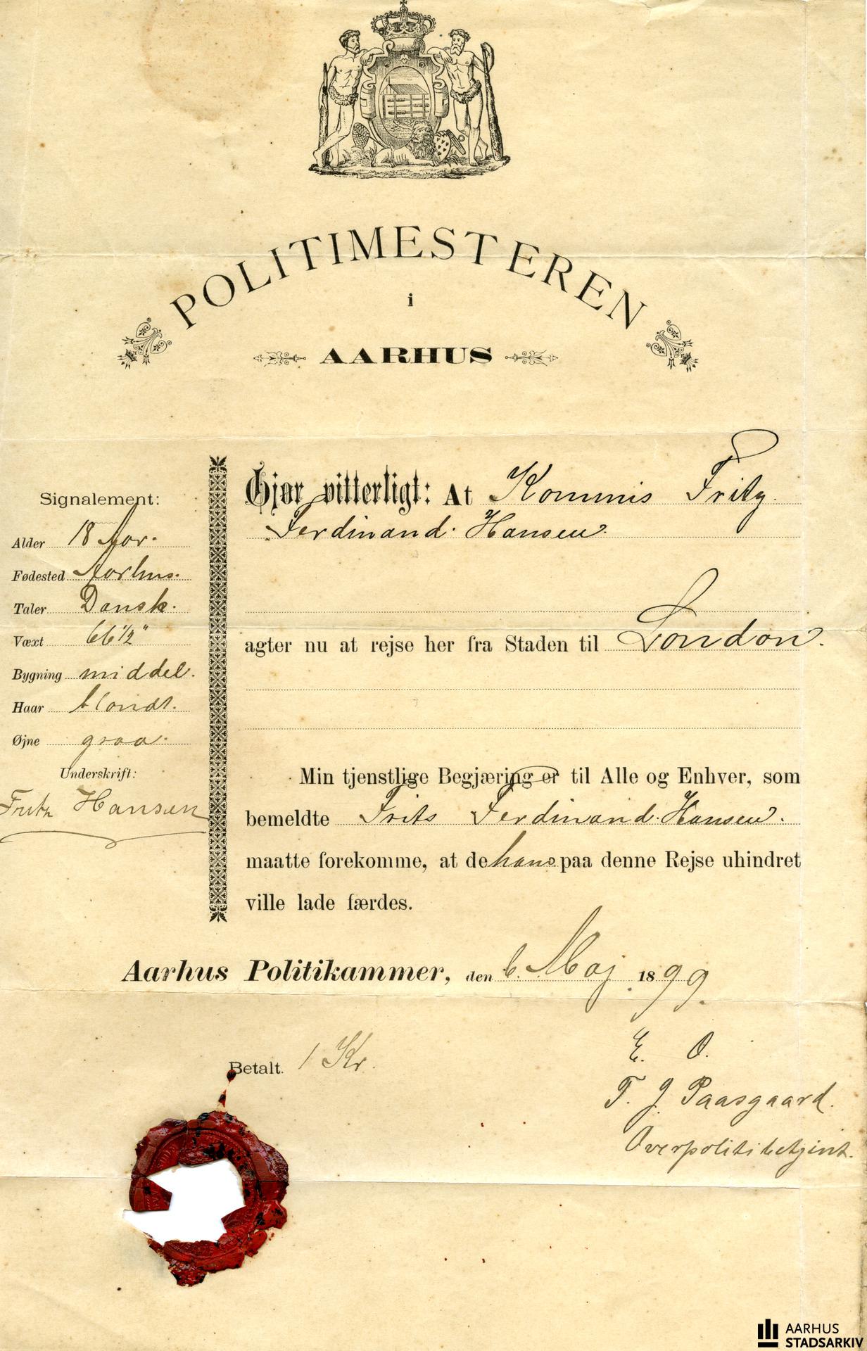 Rejsepas udstedt af Aarhus Politikammer for kaffehandler Frits Hansen 6. maj 1899.