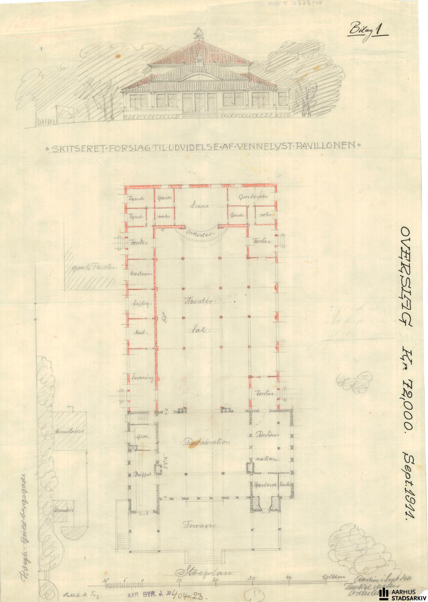 Plan- og facadetegning. Overskrift: "Skitseret forslag til udvidelse af pavillonen". Derudover påført "overslag 72.000 kr". (Tegning 5 af 6).