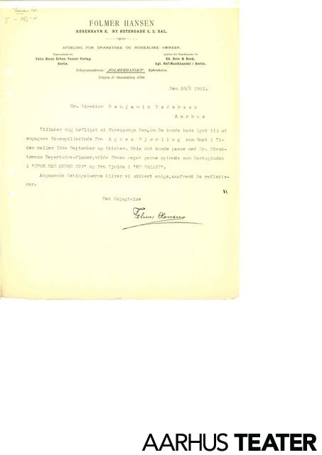 Brev fra impresario Folmer Hansen til Aarhus Teaters direktør Benjamin Pedersen