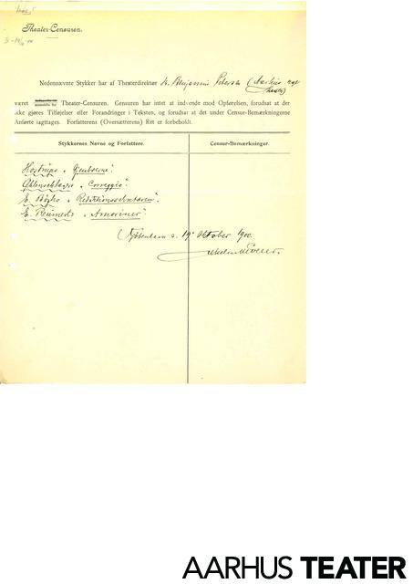 Brev fra Teater-Censuren til Aarhus Teaters direktør Benjamin Pedersen